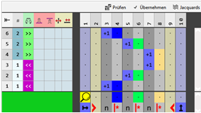 - Im Editor mit den Werkzeugen für Color Arrangement aus den Registerkarten CA und Nadelaktionen / Farben die gewünschten Einträge vornehmen.