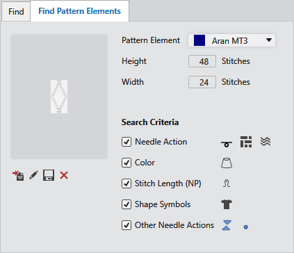 Nach den Strickelementen, Jacquards oder Nadelaktionen des selektierten Musterteils suchen. |