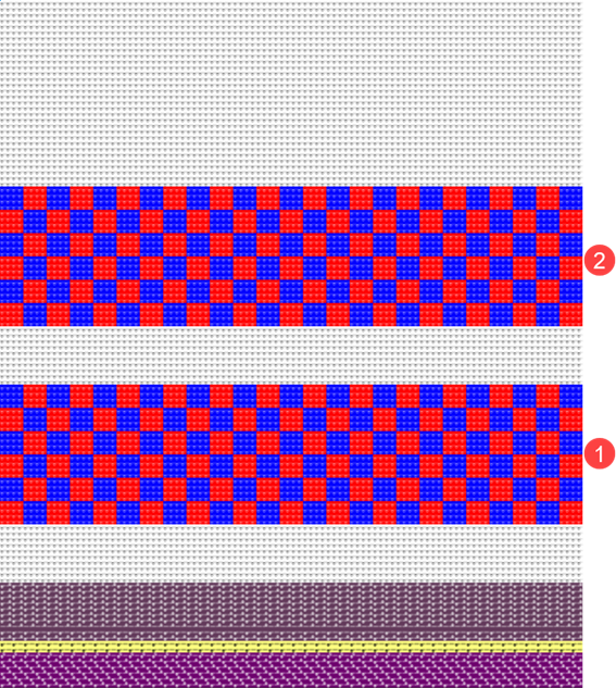 - Im ‚Ausführenden Bereich‘ der beiden Garnfarben mit Nadelaktionen die Jacquard-Vorderseite und die Jacquard-Rückseite einzeichnen: