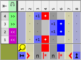Wenn Sie in eine Farbspalte Zusatzreihen mit Garnfarbe/ Fadenführerfarbe einfügen, so müssen Sie eine Nadelaktion Stricken einzeichnen. |