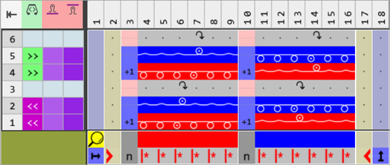 in der Multifunktionsleiste klicken. - Der Color Arrangement Editor mit dem originalen Standardstrickablauf der 2 selektierten Musterreihen wird geöffnet.