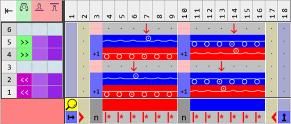 Wenn Sie in eine Farbspalte Zusatzreihen ohne Garnfarbe/ Fadenführerfarbe einfügen, so müssen Sie eine Nadelaktion Umhängen, Abwerfen oder Kulieren (kein Stricken) einzeichnen. |
