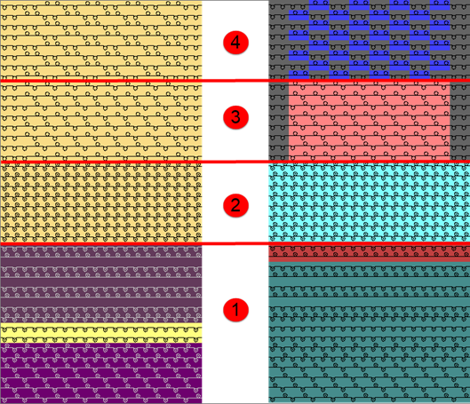 - In den Farbsegementen der Garnfarben #6 (pink) und #31 (gelb) mit Nadelaktionen die Struktur einzeichnen.