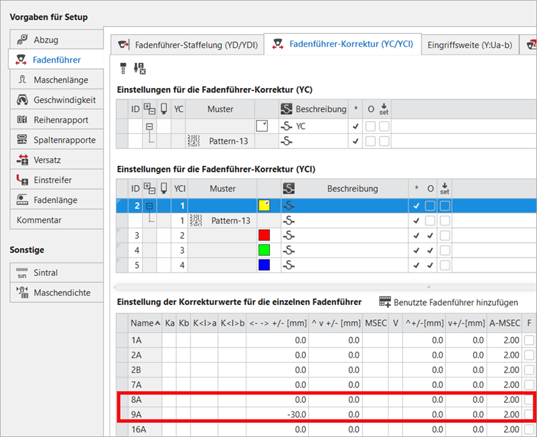 Fadenführer-Korrektur (YC/YCI) wird angezeigt.