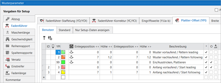 - Aus der Tabelle Plattier-Offset (YPI) die gewünschten YPI-Indes auswählen und zuordnen.