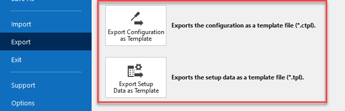 From an existing pattern project, setup data and the configuration can be exported as a template file.