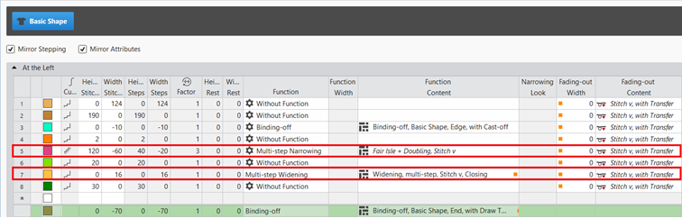 - Function Multi-step Narrowing‘ (Fair-Isle): Modify the position of the narrowing marking