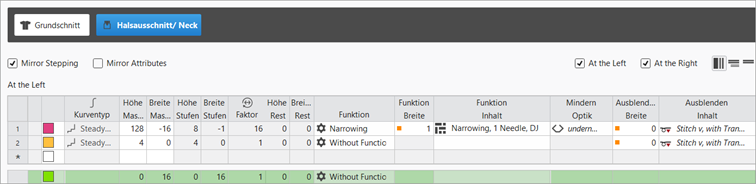 : This setting also has an effect on the neckline shape element, i.e. the V-neck shape element starts with 1 needle. - 12