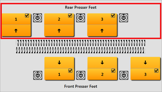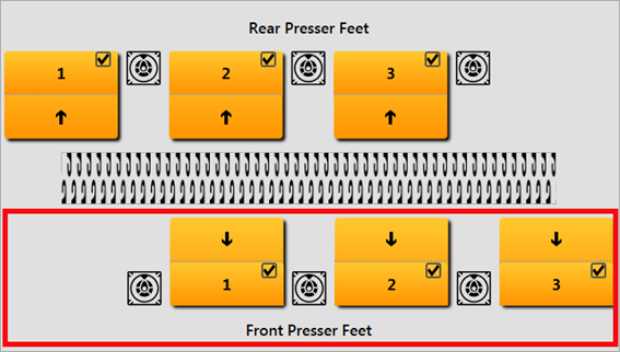 - The weft yarn presser foot is always ahead of the knitting system active.