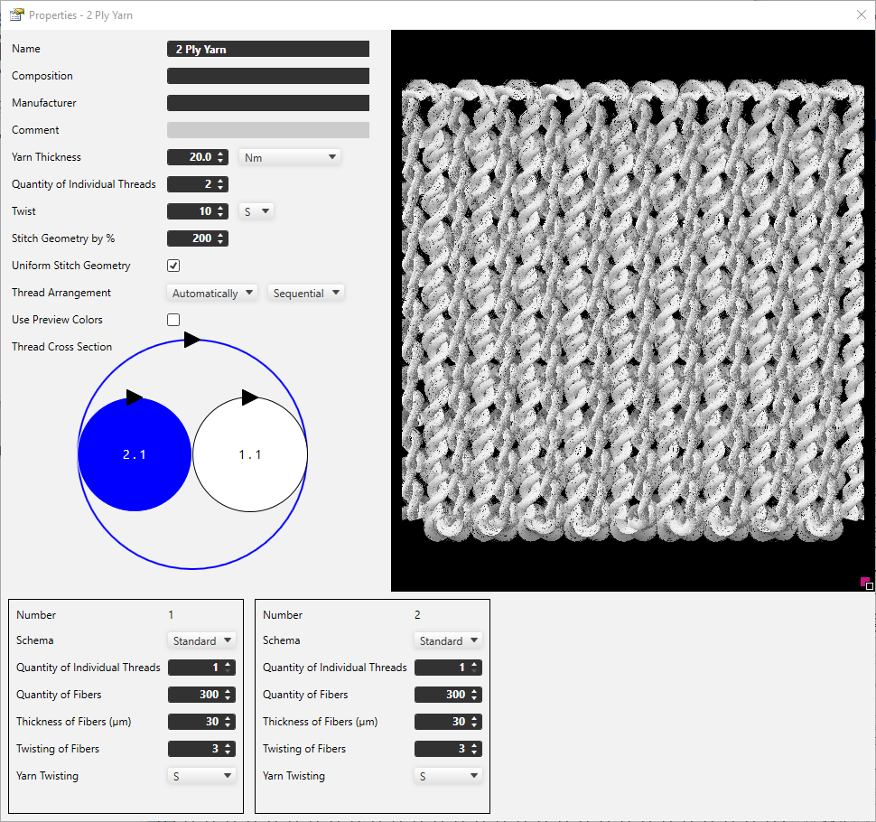 The quantity of individual threads indicates of how many individual threads the yarn type is composed. Depending on the quantity, new individual threads appear at the left side of the dialog window with further parameters. The maximum value of the plying is 20. |