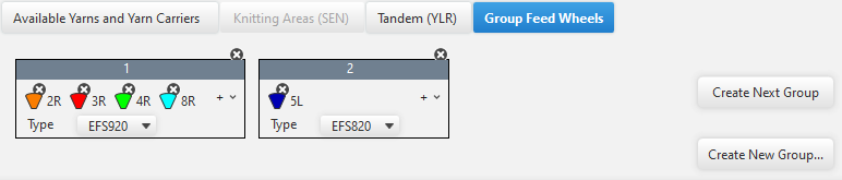 In the Agrupar alimentadores tab, you can divide the yarn carriers into groups to which you assign the corresponding feed wheel settings.