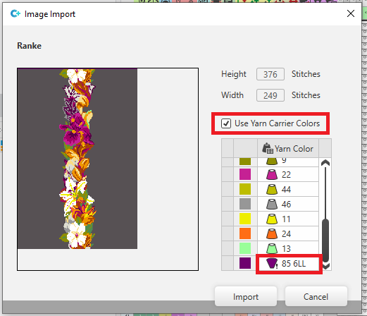 - Yarn carrier color may occur in the created pattern element by the import as the colors of picture are related to the pattern colors by the RGB values.
