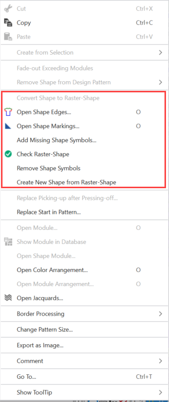 - Special items for the raster-shape are available in the context menu of the symbol view of the pattern.