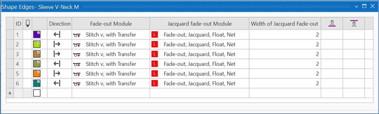 - In the Capa Z column, you can specify the order if overlaying knitting techniques of different shape markings occur.