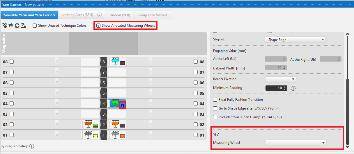 - You allocate the yarn carriers to the measuring wheels in the Guiahilos tool window of the preview of yarn carriers.