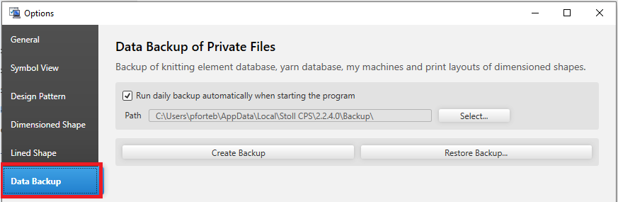Copia de seguridad para los elementos de tisaje, hilos, máquinas propias y layouts de impresión de cortes de dimensiones. -