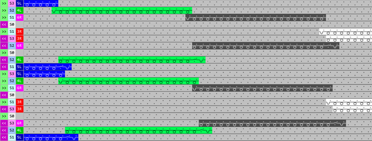 - Los guiahilos no se agruparán automáticamente. Esto corresponde a una secuencia de tisaje Intarsia lindo, uniforme con tiempo de marcha de la máquina elevado.