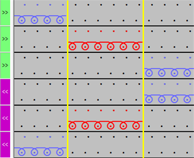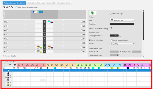 Knit Explorer. - Cada sector de color tiene un borde izquierdo y un borde derecho que pueden ser editados por separado.