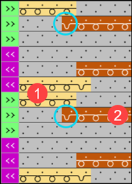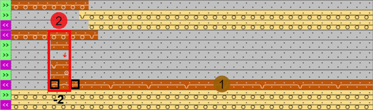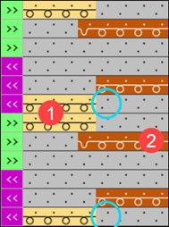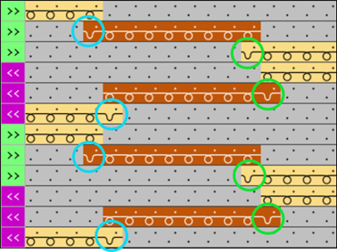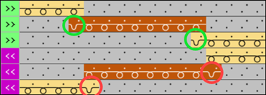 Indicación para la inserción del módulo Ligamento en el borde derecho del sector de color dependiendo de la dirección del carro