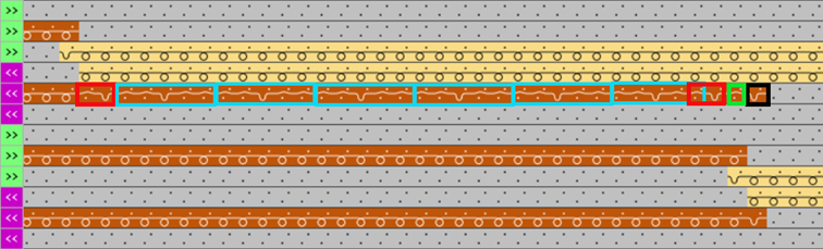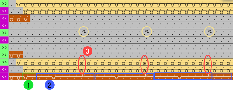 Especificación de un módulo para nudo / ligamento al final de un sector de color sin / con salir tejiendo. |