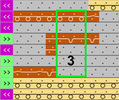 Especificación de un módulo para nudo / ligamento al inicio de un sector de color sin / con entrar tejiendo. |