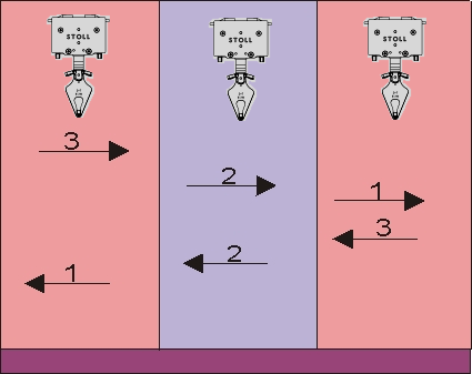 Bajo el término 'Alimentar' se entiende el posicionamiento de un guiahilos en relación a la próxima pasada de tisaje de su propio campo de color. Para esto existen diferentes posibilidades en cuanto a la técnica de tisaje. - Cada sector de color puede ser editado de forma diferente a la izquierda / derecha.