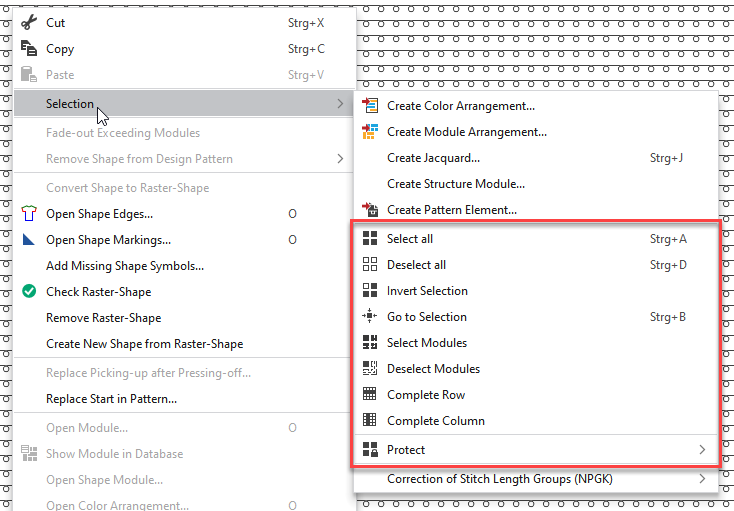 By clicking on a pattern or a group only the knitting elements that are applied in the pattern or group will be displayed in the content view.