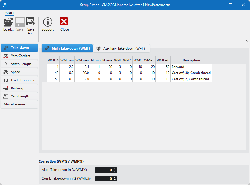 The layout of the tabs corresponds to the layout of the setup data in the pattern.