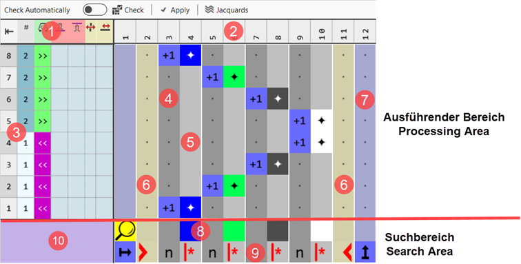 - El programa de tisaje es creado automáticamente en los sectores sin Color Arrangements y en los sectores con Color Arrangements de acuerdo al Color Arrangement. (Semiautomático)