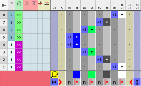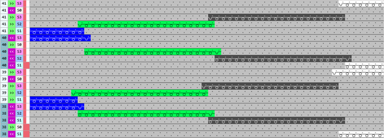 Los colores (= guiahilos) del 'sector de ejecución' del CA son ejecutados de acuerdo al número de sistemas de tisaje de la máquina seleccionada.