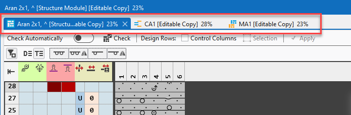 - All the Knitting Elements will appear in one single document window with different tabs.