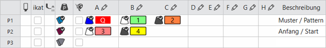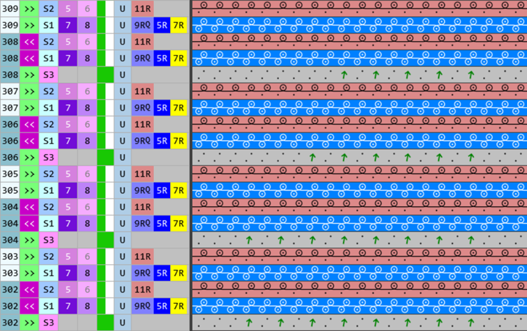 The yarn carrier with yarn color #2 of the plating color P1 knits by system S1 |