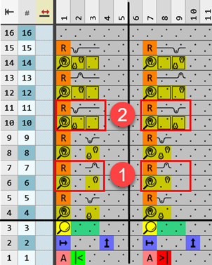 Zur Überprüfung der Nadelbelegung im Muster und Definition von Nadelgruppen (Rapporte)