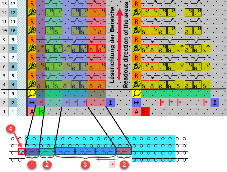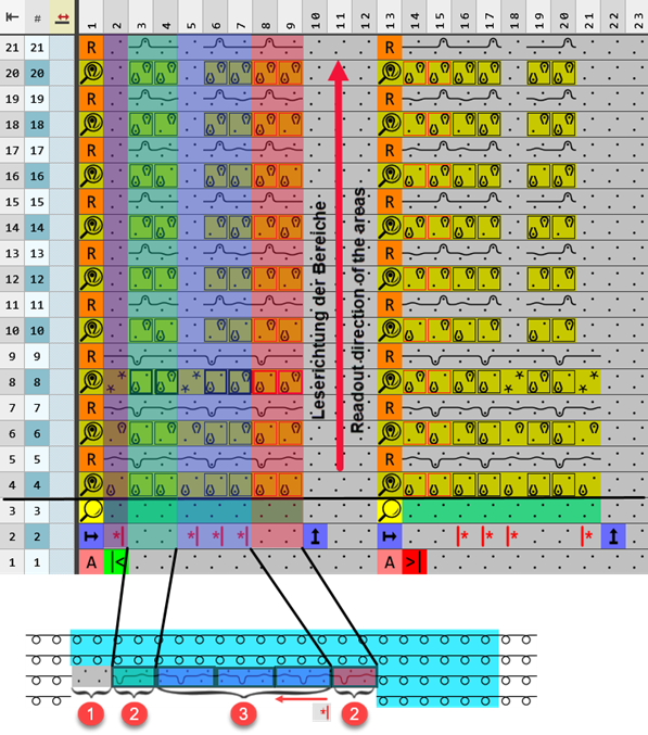 Das Lesen einer oder mehrerer Spalte wird beim Auffinden der zutreffenden Nadelbelegung beendet und die Strickinformation aus der Referenzreihe