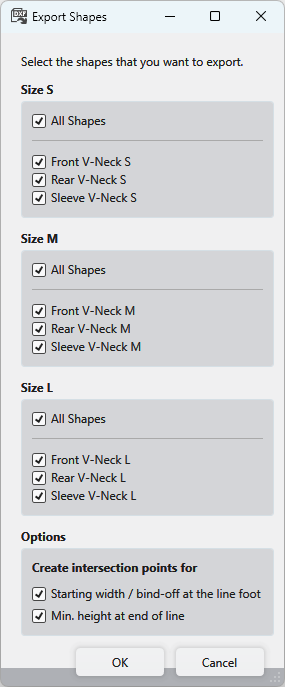 Select the shapes or the sizes that you want to export and confirm the selection.