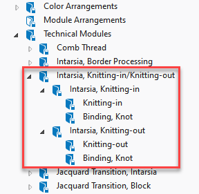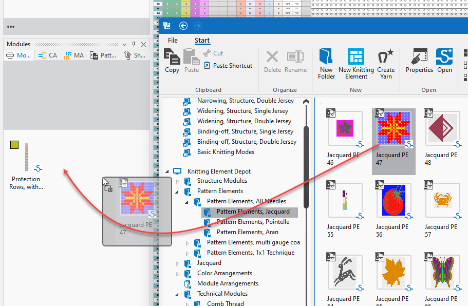 The knitting element or yarn will be copied to the corresponding tool window or to the corresponding path of the Modules tool window. - In each dialog box with selection of a knitting element, you can drag and drop it from any desired folder to the selection field.