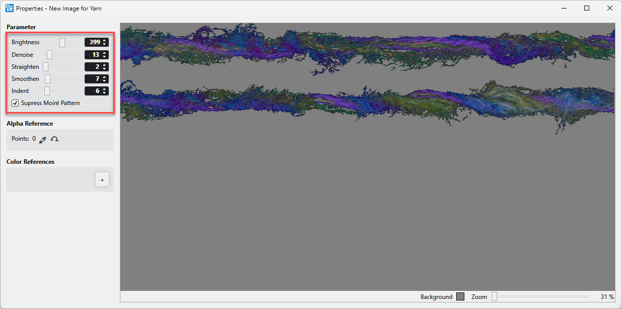 Yarn properties (yarn from the image) - Make the following settings for the scanned yarn in the Parameter dialog box: