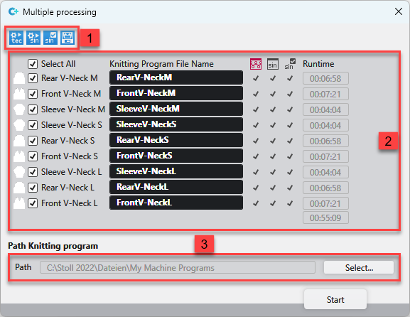 You start the joint technical processing and creation of the knitting programs exclusively in Multiple Processing dialog box.