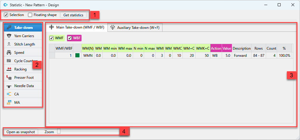 You will find the statistical evaluations of the settings and the knitting elements of a pattern project in the Statistics dialog box.