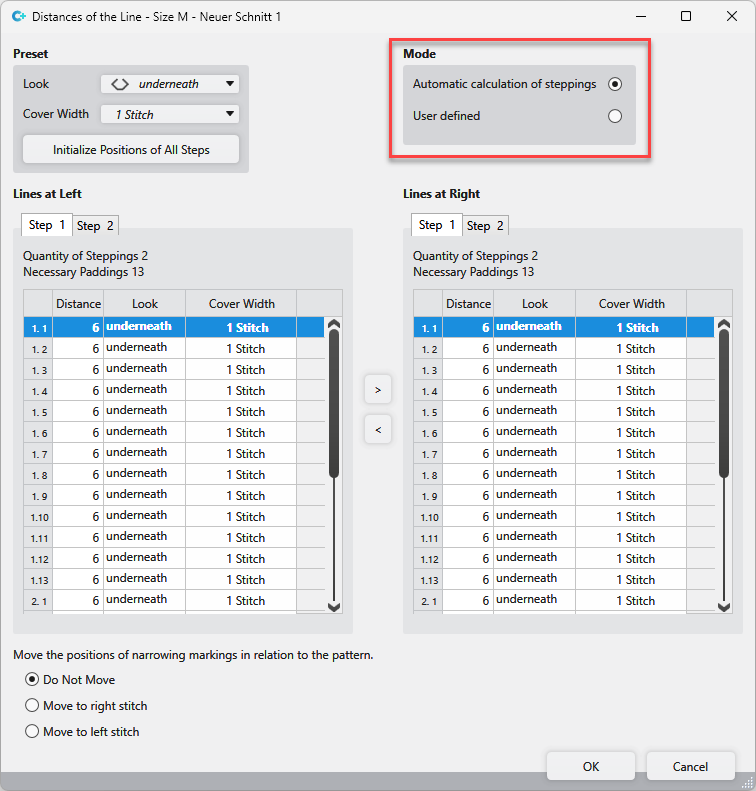 Now you can select the calculation of the steppings in the Distances de la ligne tool window: