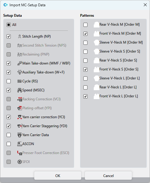 - In the left area, select the pattern parameters you want to import from the selected Setup file.