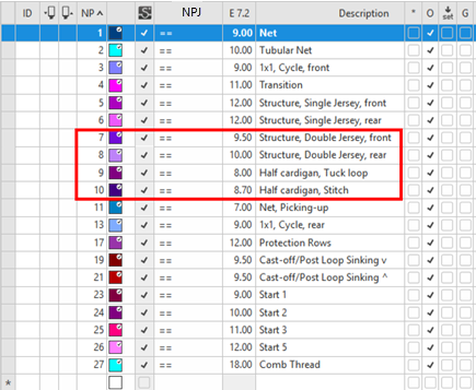 - Different colored entries for stitch lengths are entered in one pattern row in the design pattern.