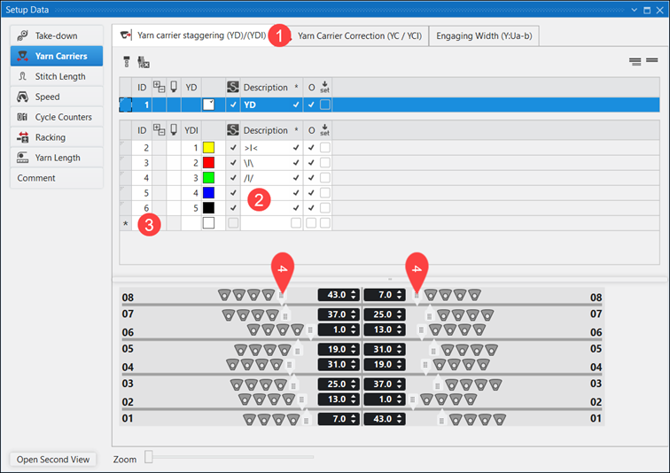 2 | YDI 4 + YDI 5 | Table entries without specifications for yarn carrier staggering