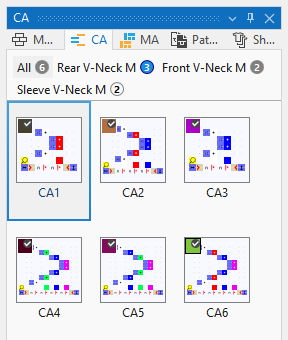 Beside each name appears the quantity of CAs that are contained in the pattern. By clicking on the pattern name only the CAs applied in the pattern are displayed. By clicking on Tutti all CAs of the project are displayed.