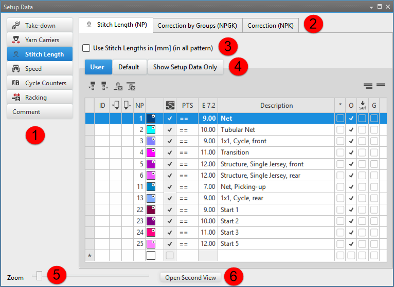 Column labels of the stitch length tool window