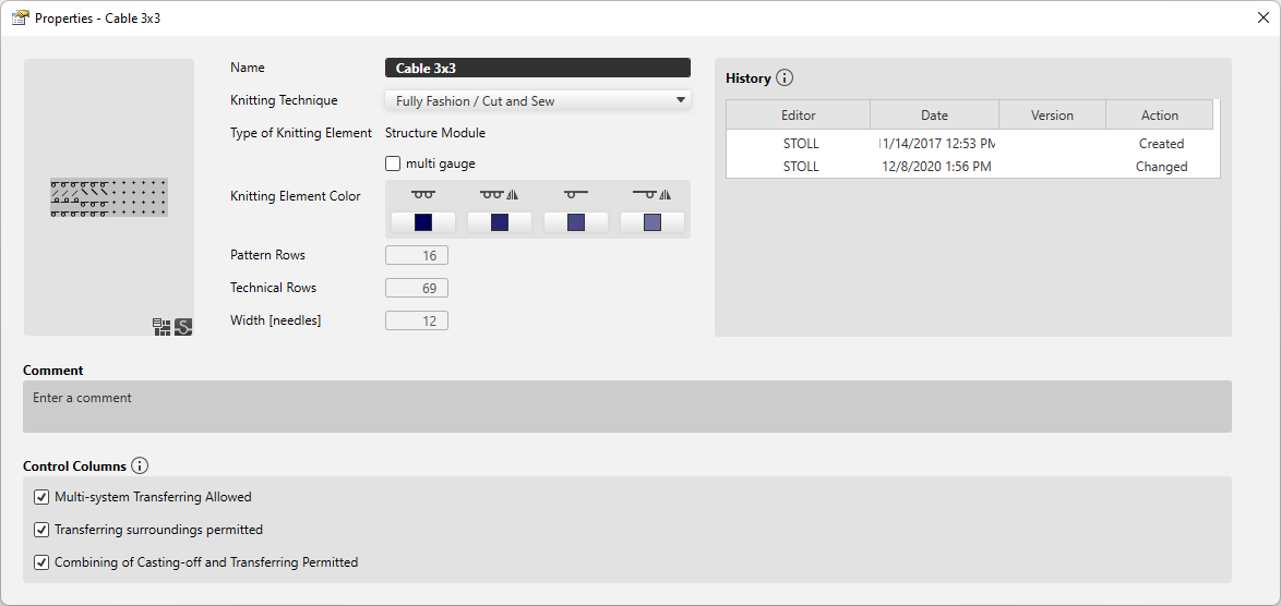 Displays the knitting element type. The knitting element type points to the use. Specific situations only allow specific knitting element types. |