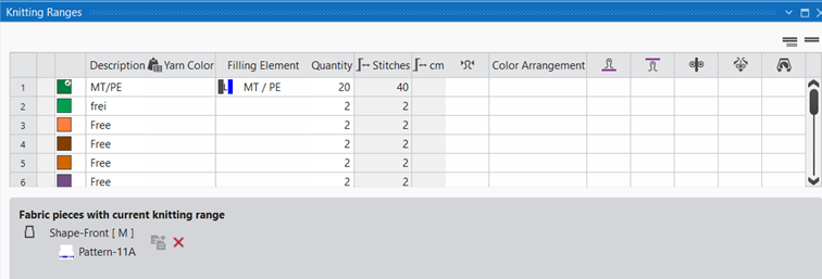 List of the shapes (fabric pieces), where the selected knitting range is in use.