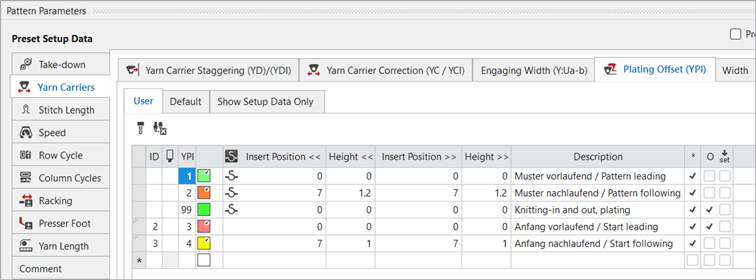 - Select the desired YPI indices from the 添纱偏移 (YPI) table and allocate them.