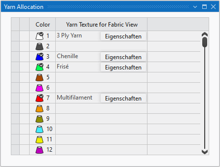 已分配纱线 Displays the yarn from the 编织资源管理器, that was defined for the corresponding pattern color for the presentation in the fabric view. The yarn selection cannot be changed here but you can open and edit the properties of the yarn. The changes are applied in the 编织资源管理器. |