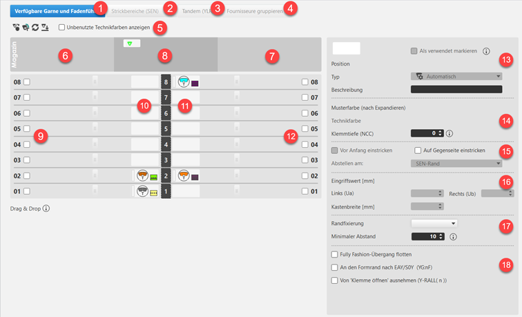 Registerkarte Verfügbare Garne und Fadenführer | |